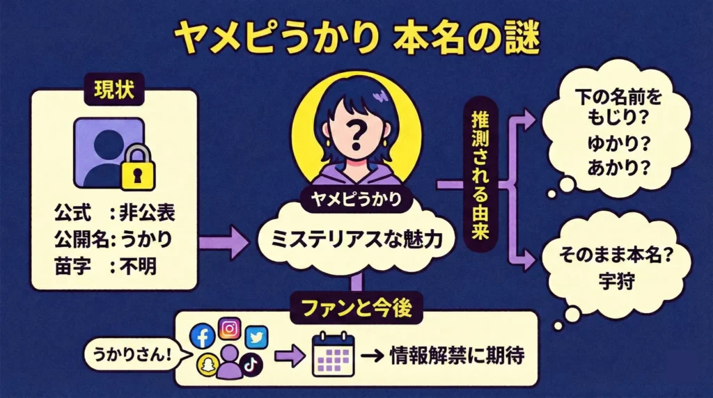 うかりさんの本名についてですが、公式プロフィールでは「うかり」という名前のみが公表されており、本名は明らかにされていません。